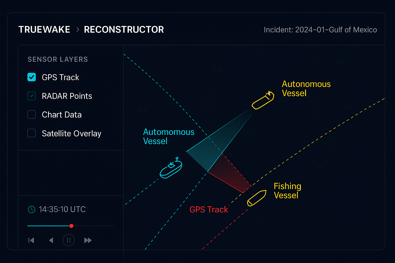 TrueWake rebuilds incidents with millisecond precision—synchronized sensors, identified maneuvers, and COLREGs-based encounter classification.