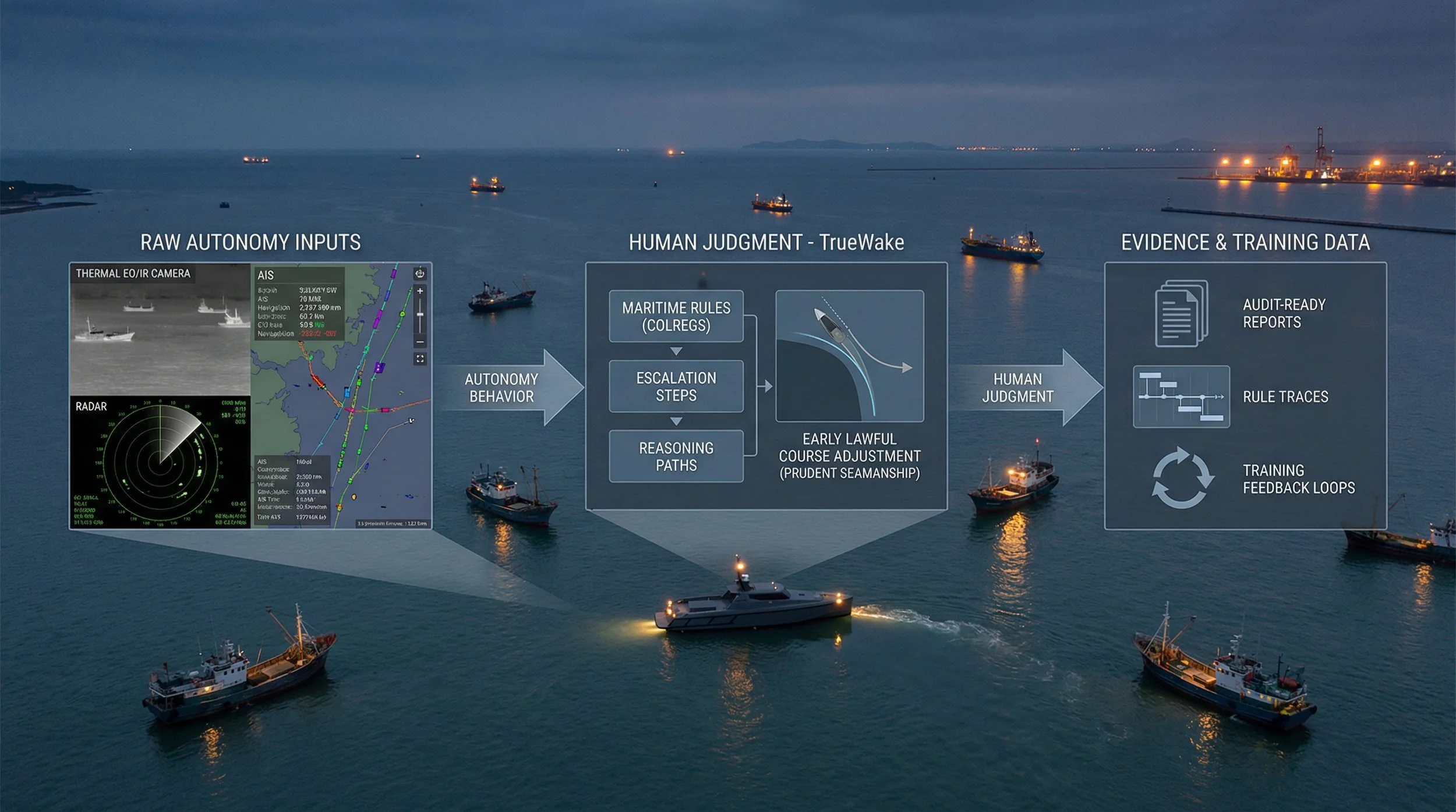 TrueWake turns every vessel—crewed, hybrid, or autonomous—into a transparent, explainable, and legally defensible source of truth.