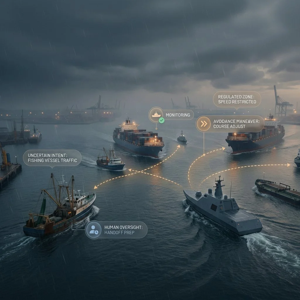 Every encounter is interpreted under COLREGs, SOLAS, and MASS.