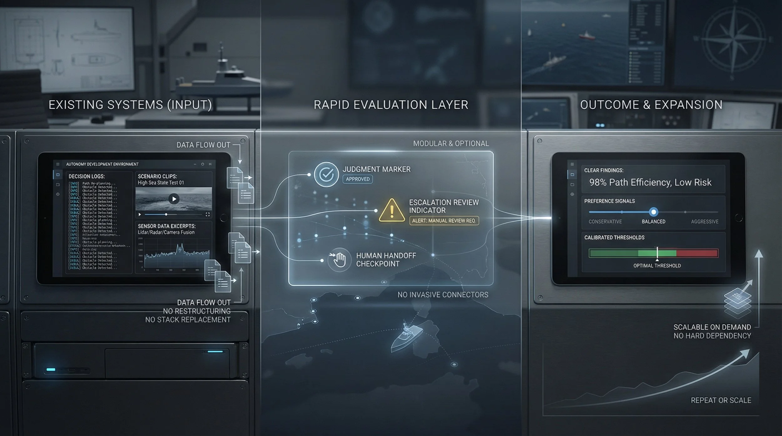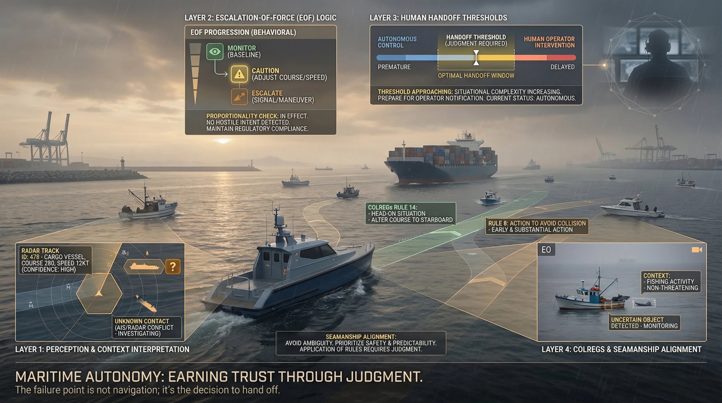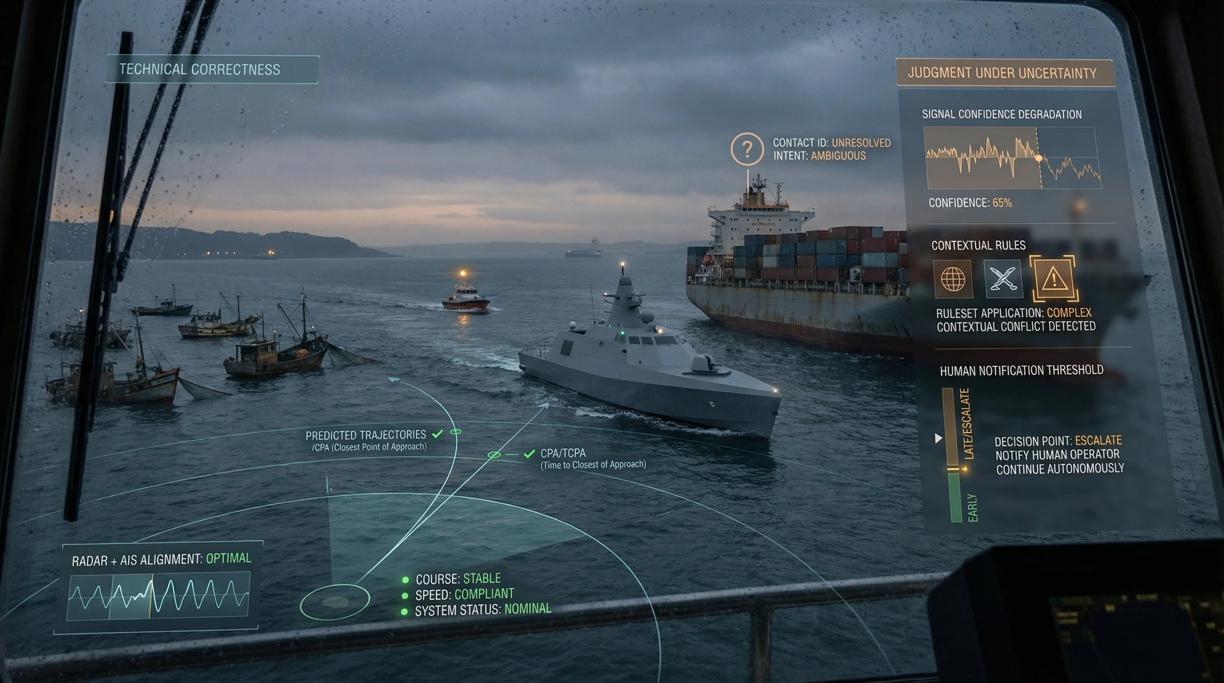 TrueWake provides a human judgment layer for maritime autonomy — evaluating and shaping how systems escalate, explain, and hand off under uncertainty.